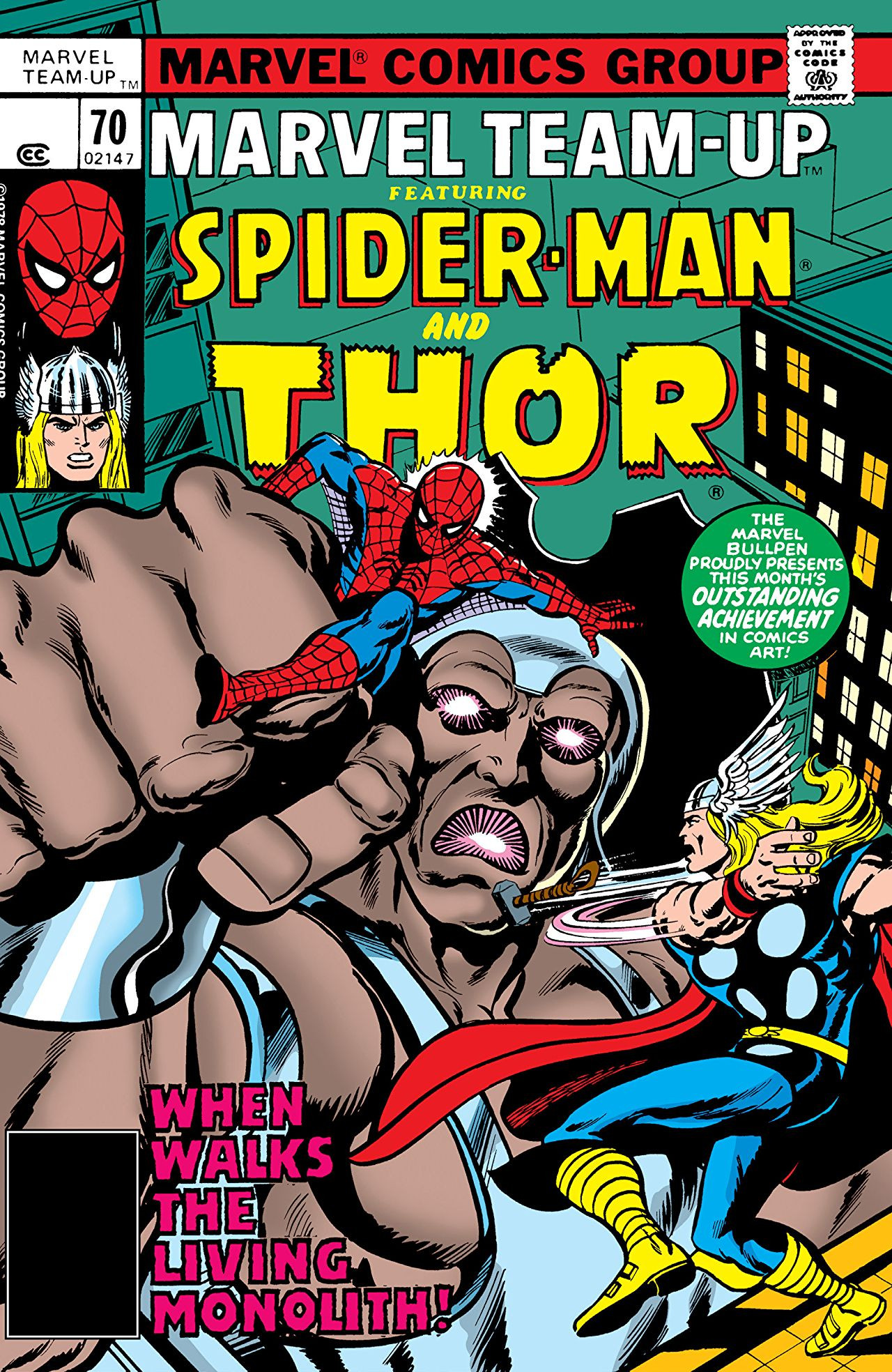 The Living Monolith has risen once again and is rampaging through New York City with Spider-Man in his clutches. Spider-Man attempts to trip up the foe by firing webbing into his eyes, but the Monolith pulls it off easily and, growing tired of Spider-Man, tosses him away. Unable to snare the side of a building to slow himself down and prevent himself falling to his death, Spider-Man is saved at the last moment by Thor. Taken to safety by the Avenger, Spider-Man explains everything that has happened and points the Living Monolith out to Thor.