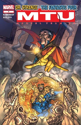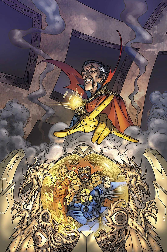 Meanwhile at the Baxter Building Johnny Storm emerges from the shower angry that Ben Grimm has replaced his shampoo with green hair dye. The Thing and the Human Torch prepare to fight. Mister Fantastic attempts to get between them but in the end they are stopped because Invisible Woman lectures them on how the children could get hurt. But before she finishes they are attacked by who they think is Doctor Doom. Mister Fantastic manages to get the children to Attilan via portal before joining the fight. However "Doom" is startled at the fact Johnny is alive and flees. As they prepare to chase him, Doctor Strange appears before them and offers help. Meanwhile, elsewhere, Paul Patterson awakens to find the Hulk looking down on him. Later, in the city again, the FF and Doctor Strange prepare to battle "Doom". During the fight "Doom" accuses Strange of being behind Johnny's "Resurrection". After a long battle, "Doom" realizes he has been referred to as Doctor Doom and reveals himself as Tony Stark.