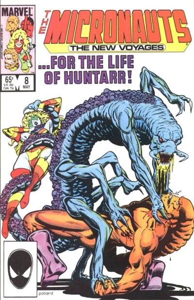 In the engine room of the Endeavor II's wreckage, the egg the Micronauts had taken hatches and a menacing multi-limbed alien emerges from it. The creature wanders through the facilities of Central City as various Children of the Dreaming Star see it and are awed by its presence. It eventually arrives to the infirmary where Huntarr and Solitaire look after the Micronauts and attacks Huntarr. Huntarr puts up a fight but the creature is immensely powerful and able to hurt him unlike anything has before. Solitaire demands some guards to assist but they inform her that the creature is a "prime being" and they dare not. Eventually, Huntarr is speared by a protrusion from the creature's head. He quickly transforms into an amorphous expanding mass forcing the others to flee. Ultimately, however, his new form oozes over the sick Micronauts and causes a cellular rebirth of them, including himself. They all emerge healthy and well and Huntarr comes to terms that he might actually offer some value to the Micronauts after all.