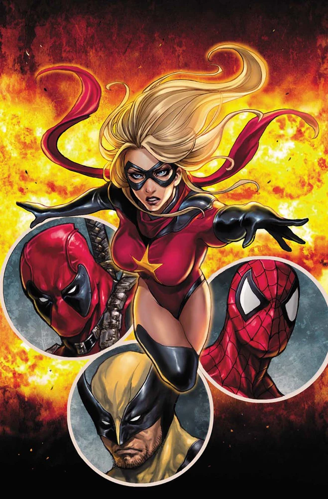 Back in New York City, another female energy being - this one green - makes its presence known to a web-slinging Spider-Man, while a pink energy being appears at the New Avengers' hideout where Luke Cage and Wolverine are watching baby Danielle. Cage and Wolverine realize the entity is trying to communicate with them when she uses her energy blasts to form a familiar symbol - the lightning insignia of the original Ms. Marvel, Carol Danvers.