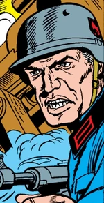 Oberleutnant Shultz participated in Baron von Strucker's trick to bring the Howling Commandos out into the open. After being soundly defeated along with his men, as soon as he resumed he warned Strucker by radio that the enemies had fallen into the trap.[43] |