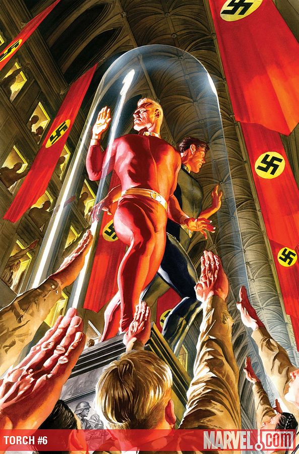 Nazi scientist Dr. Sigmund Fell escaped to South America after the war to create a secret society Synthezoids. The one flaw with the androids was that, when exposed to air, they would burst into flame. Secreted within a sealed city specially treated air prevented the androids from bursting into flame, and the citizens believed themselves to exist within the actual Berlin of a world ruled by the Nazis.[1] Fell recruited the Mad Thinker to help with his creation, the “Inhuman Torch”.[2]