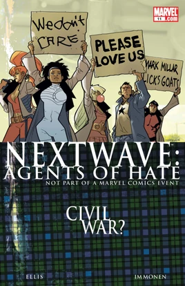 - The cover is a humorous parody of the ongoing Civil War series that was happening at the same time as Nextwave was being published. While not actually participating in the event the cover is designed like covers of participating series.