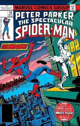 With the White Tiger interrogation of Professor Vasques is interrupted by the arrival of Spider-Man the two get into a fight. Their battle brings them outside of the ESU campus where students and security are boiling to the clashing point over the theft of the Erskine manuscripts.
