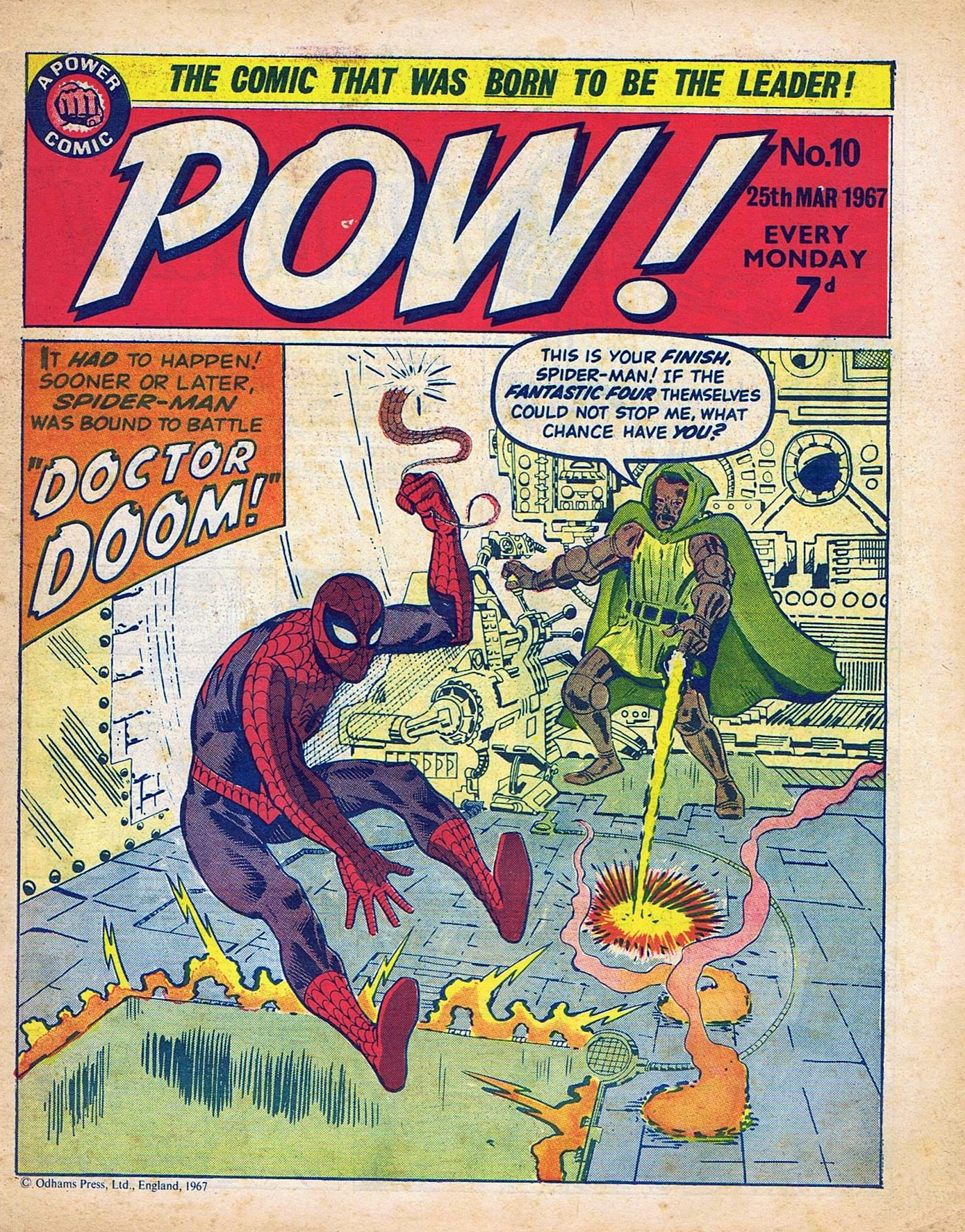 Spider-Man goes to Flash's rescue, and manages to hold his own against Doom's weapons and attacks. However, when the Fantastic Four arrive as well, Doom decides to flee the battle. Spider-Man decides to leave as well, leaving the Fantastic Four to rescue Thompson, hoping that he learns his lesson. The next day at school he sees otherwise, as Flash boasts about his experience. Peter, needing to keep his identity as Spider-Man secret, of course cannot say anything otherwise.Appearing in "The Brave Die Hard!"