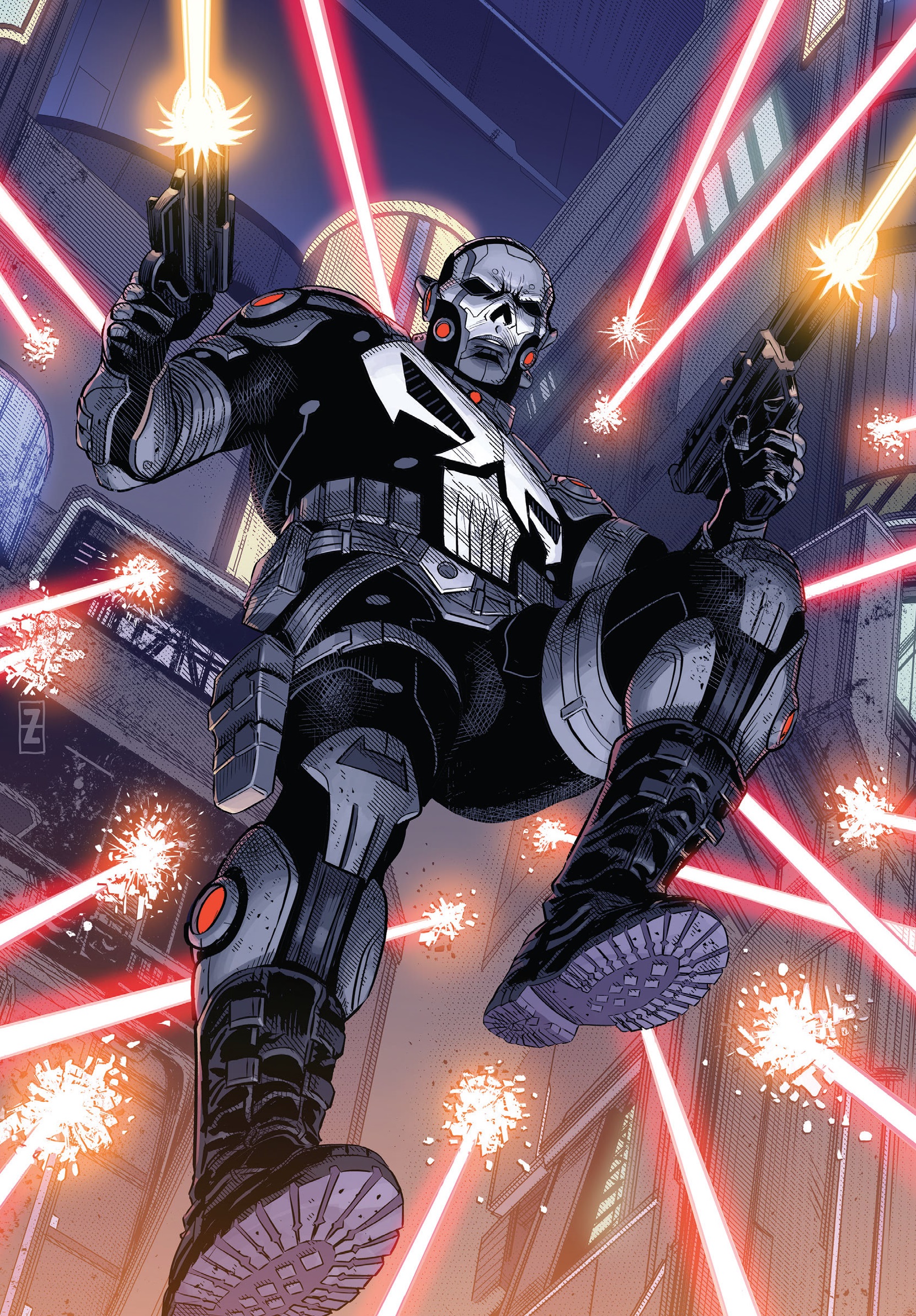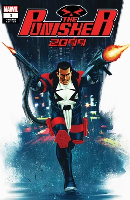 The future has arrived, but world peace certainly hasn’t! In fact, with the streets of Nueva York more crime-ridden than ever, who will rise up to defend the vulnerable population from the corruption? Looks like it’s up to Punisher 2099 to clean up the block – the only question is, who’s behind the mask?