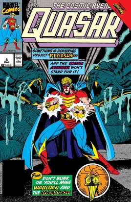Continuing his census of aliens that are currently living on Earth, Quasar finds himself on the rooftop of the New Mutants New York headquarters. There he meets with the New Mutants Warlock, Cannonball and Sunspot. Getting them to stand down, he tells them that he only seeks to learn about Warlock's alien origins and do a threat assessment. The New Mutants try to describe Warlock best they can and Quasar, seeing 'Lock's comedic attitude determines him to be no threat and leaves before he can lose his straight face. Reporting back to Eon on his findings he goes after the next anomalous reading.