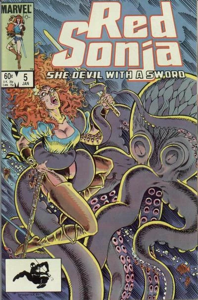 Because you demanded it, Robert E. Howard's She-Devil with a Sword goes monthly! Red Sonja finds herself reunited with her old compatriots Achmal and Galon. But the pleasure of this reunion is cut short by the threat of death - theirs! "Islands of the Inland Sea!" written by Bill Mantlo and drawn by Pat Broderick. 60¢.