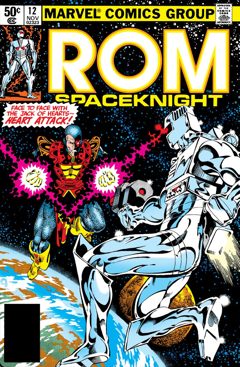 As the Jack of Hearts is training at “The Farm” in nearby Maryland, a distress call arrives from Project Safeguard. Rom uses his Analyzer to identify Wraiths among the security forces and banishes them as the Jack of Hearts arrives to see two disguised Wraiths fleeing. Rom banishes them and the Jack of Hearts quickly attacks him. Rom mistakenly surmises him to be a Wraith and fires his Neutralizer on him. Since he was not banished, Rom realizes his error and uses his Analyzer to reveal that the Jack of Hearts is pure energy. Rom holds back for fear of harming the human but the Jack of Hearts unleashes all his fury forcing Rom to head into space to shed the energy his armor has absorbed. The Jack of Hearts follows and Rom tries to drive him away before his armor explosively releases the energy. As he does so, the Jack of Hearts hits him with yet another blast that triggers the release. Believing Rom is dead, the Jack of Hearts returns to Project Safeguard to the adulation of those remaining. Meanwhile Rom drifts senselessly in space until he finally falls into the atmosphere and plunges unconscious into the ocean.