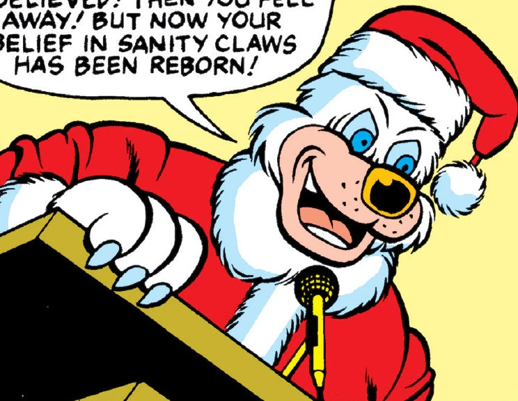 An old anthropomorphic polar bear who delivered gifts to children yearly, Sanity Claws had repeated bouts of insanity whenever he donned stocking caps due to the elastic bands pressing his brain too much. He repeatedly clashed with superhero Deerdevil, first when Claws began a spree of entering homes through chimneys to steal milk and cookies and fill in socks drawers with coals; and later when he began a cult. Once Deerdevil removed his cap, Claws recovered and even forgot his criminal deeds.[1]