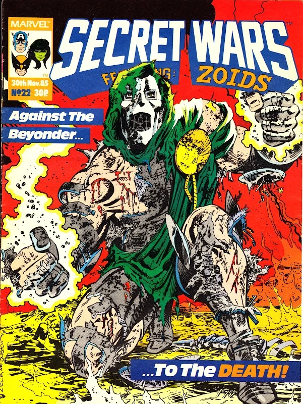 Doctor Doom has been defeated, his ravaged body now lays on the surface of Battleworld. However soon he is enveloped in energy and his mind probed. Doom's life flashes before his eyes: his discovery that his later mother was a witch, how he became a famous defender of his people, the accident that ruined his face, his rise to power in Latveria and his endless quest to rescue the soul of his mother from the clutches of the demon Mephisto. Unwilling to die, Doom suddenly finds his body being recreated and his armor repaired by the energies swirling around him. This rebirth is causing more earthquakes that threaten to bring down Doombase around the heroes. Captain America calls and evacuation as well as orders their prisoners to be freed so they can escape themselves. The heroes regroup outside just as Doombase crumbles to the ground. Suddenly there is a blinding flash of light that appears above them and changes into a massive Doctor Doom. Doom announces that the Beyonder is dead, and shrinking back down to human size, Doom removes his mask and declares the Secret Wars over.Appearing in "The Price You Pay!"