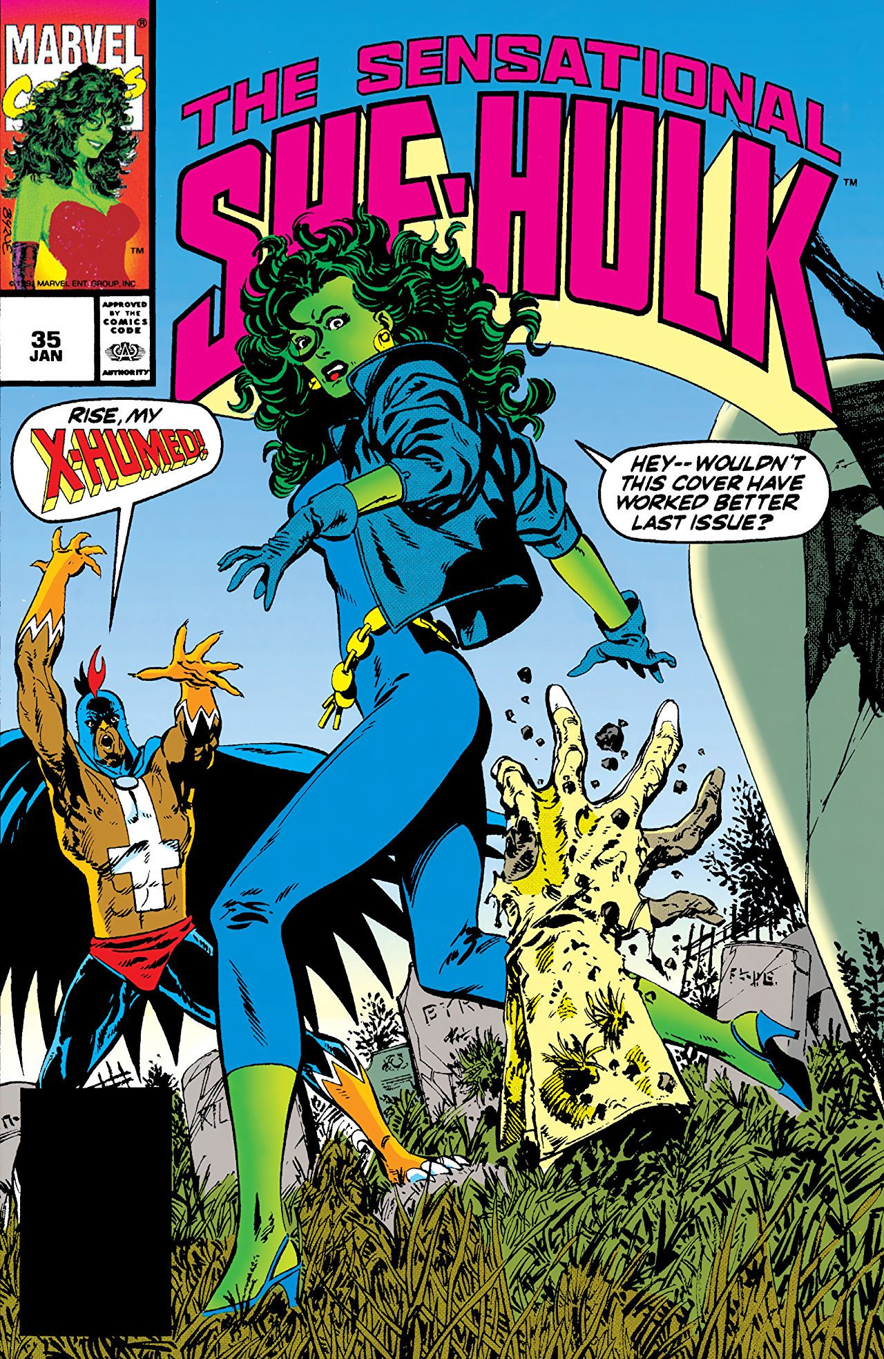 The Keeper then pushes her back into the story, where the Changeling is reaching for Weezi. She-Hulk grabs him and tosses him at the rest of the X-Humed. Jen then frees Weezi from the post she was tied to.