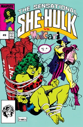 After fighting through the hallucinations brought on by Madcap, She-Hulk recovers her senses. She-Hulk confronts her foe and demands answers as to why he is doing this. Madcap explains that he believes that life is meaningless, and he subdues her again. While she is under his mind control, she starts to fight against a fake whale, and some after she recovers again. She-Hulk catches up with Madcap who uses his powers to enrage three boys and set them to attack her. She-Hulk subdues them the best she can and go after Madcap again. He then uses his powers to for Jennifer to eat garbage. While he's doing this, he tries to amuse some children by stabbing a knife through his head. However, the kids fail to see the humor in anything he is doing.