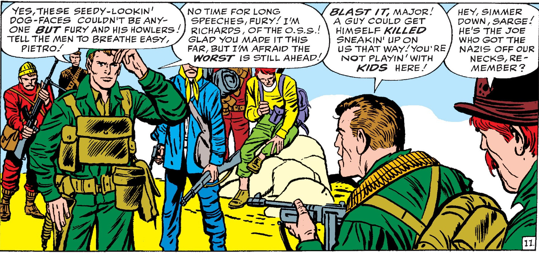 - An editorial note reveals that Major Richards will become Mister Fantastic of the Fantastic Four. Richards appearance is the first crossover in this series, and establishes that the Howling Commandos exist in the Marvel Universe. Similarly, Ben Grimm will later appear in Capt. Savage and his Leatherneck Raiders #7.