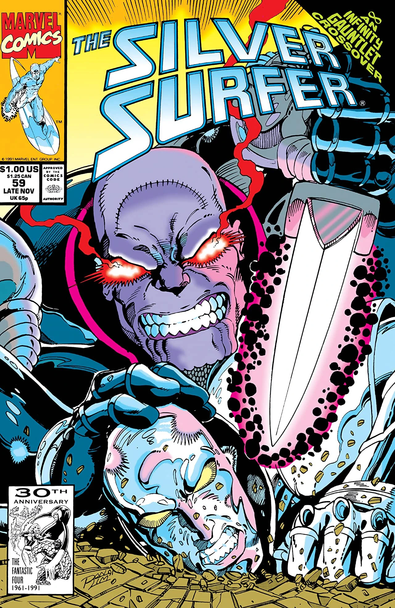 In the Sanctum Sanctorum, Silver Surfer angrily attacks Thanos. Doctor Strange summons a handful of heroes, and Doctor Doom, to help break up the fight. Doom suggests that they definitively settle their differences with a duel. Strange transports the essences of Silver Surfer and Thanos to another dimension, while their physical bodies remain behind in mystic shackles. Without their usual powers, the two battle with medieval armor, lances, and blades instead. Downed and on the verge of defeat, Thanos begs Silver Surfer to kill him. Silver Surfer chooses to let him live, admitting they need his help to defeat Nebula. Thanos treacherously tackles him from behind, compels Silver Surfer to submit, and formally wins the duel.