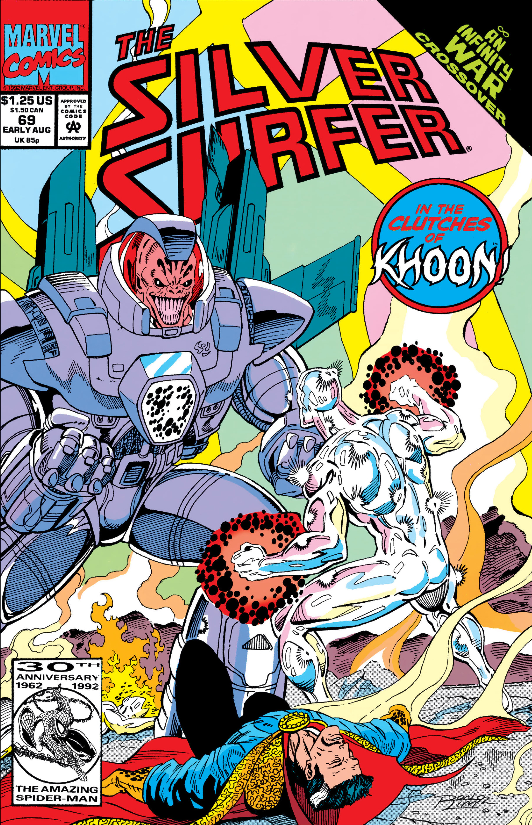 Khoon demands that Nova and Silver Surfer surrender their ship to him. They refuse and fight back. Nova becomes untethered from the ship and begins falling into the dimensional corridor. Khoon catches her cable, but threatens to let go if they do not bring him inside. He confronts Galactus and explains his origin. Khoon had been an explorer and a conqueror in his dimension. He was trapped in the dimensional corridor after his ship tore apart. After Khoon reveals that his battlesuit contains navigational charts of the corridor, Galactus forcibly merges him with the ship's machines.