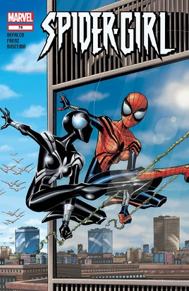 The two male heroes criticize Spider-Girl's current fashion, but then get into their real issue: they hear she may be entangled with the Black Tarantula. Spider-Girl only confirms their fears when she deflects by saying they don't tell her all of their secrets. Before she can leave, Kaine shows Spider-Girl a photo of Elan deJunae - someone who once worked with the original Green Goblin - whom he knows is in town. Spider-Girl has seen her with Normie recently, but she does not disclose this to Kaine.
