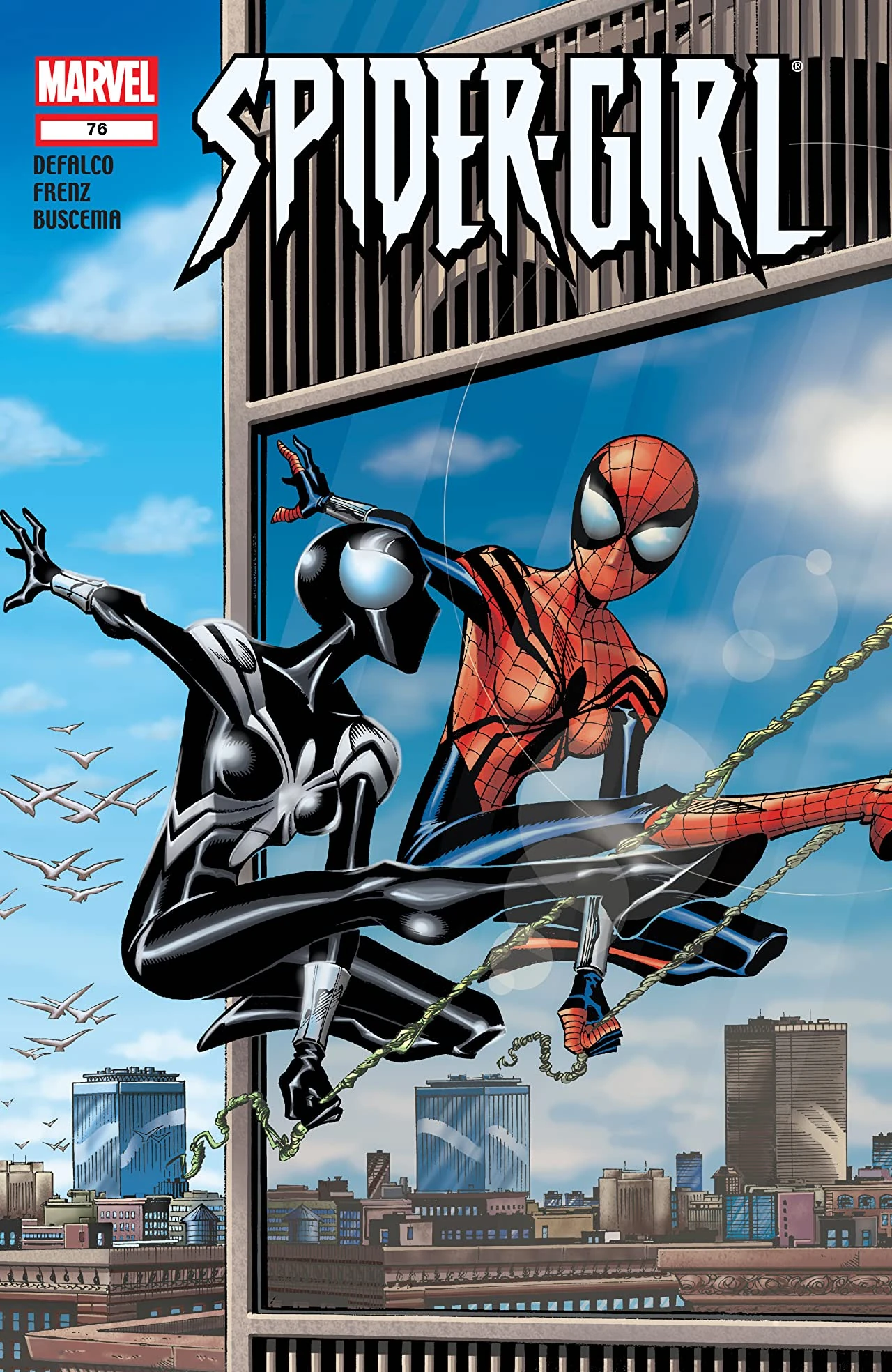 Up on the roof, May changes into Spider-Girl, using the red mask from one of her father's suits, with the body of her black suit. She visits Avengers Mansion and confesses to Jarvis that she hates her hyrbid costume. Spider-Girl hopes to see Stinger for help, but Jarvis tells her that the Avengers are away on a mission. She takes a call while she swings away, thinking it's June, but she is instead summoned to a rooftop meeting with Darkdevil and Kaine.