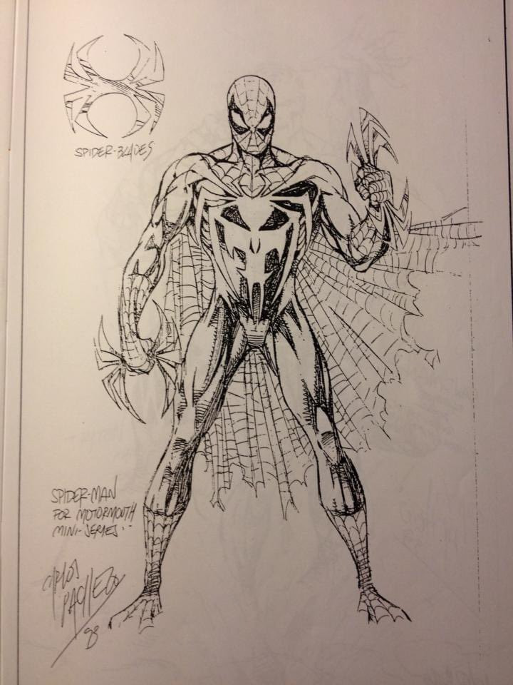 On Earth-32943, Peter Parker's suit had a much different torso. His logo was an amalgamation of a large spider and a human skull. The top two legs of the spider extend into its shoulders. The webbing pattern stopped at the top of the spider. The suit also included a webcape. | Carlos Pacheo (October 28 2020). Carlos Pacheco discusses canceled Motormouth Re-Mix. Twitter. Retrieved on November 11 2020. |