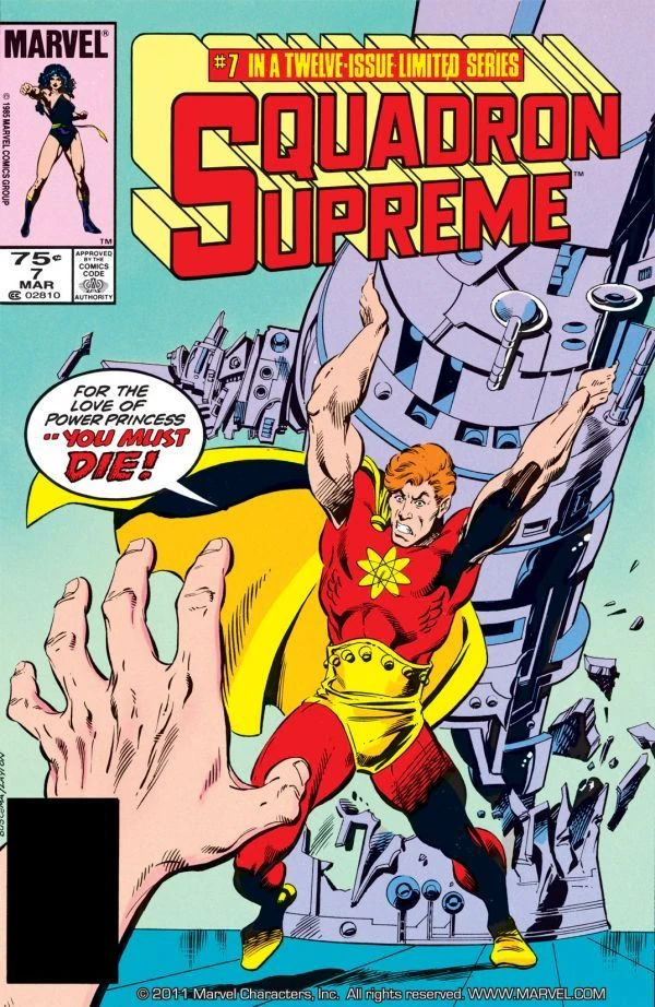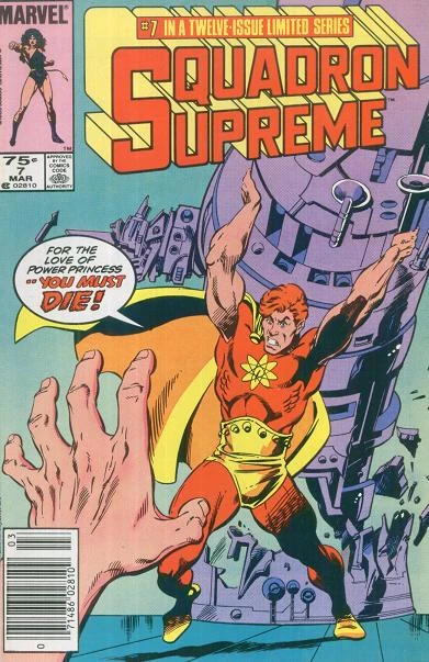 At a meeting, Power Princess tells the rest of the Squadron that she will oversee Hyperion's recuperation, and take command of the team until he recovers. When she goes back to the imposter's bedside, he takes her flying, and they begin to feel attracted to each other and almost kiss. After finding out where she lives, 'Hyperion' spies on her afterward and is disgusted to see she is married to the physically much older Howard Shelton (as Power Princess does not appreciably age). Later, Power Princess comes into the hospital the imposter in recuperating in, carrying the lifeless Howard in her arms. Howard doesn't recover from the heart attack he has apparently suffered and dies, leaving the Hyperion imposter to comfort Power Princess.