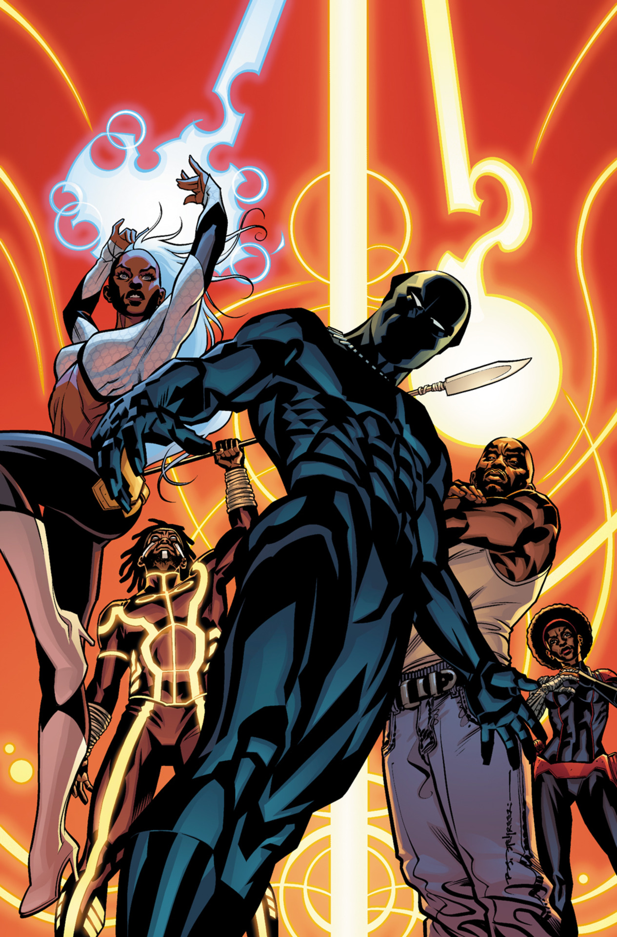 T'Challa helped reunite Ororo with her surviving family members in Africa, as well as introducing her to her long-lost grandparents in America. Not shortly after, T'Challa proposed to Ororo.[160] The two were soon married in a large Wakandan ceremony and then headed off on a diplomatic world tour for their honeymoon.[161]