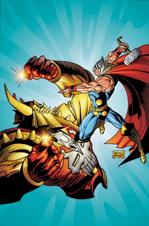 The battle against Kurse is not fairing well for Thor at his usual strength. Realizing more power is needed he rushes back to his chariot where he recovers his Belt of Strength and puts it own. Even with his enhanced strength, he finds that Kurse is able to still match his abilities. The Beyonder at this point has appeared over the battle and finds Thor's resolve and code of honor interesting. Curious, the Beyonder sees what would happen by increasing Kurse's powers even more. Thor is easily trounced but does not give up, making the Beyonder wonder what sort of desire keep Thor fighting against impossible odds. He is even more confused when Beta Ray Bill and the Power Pack arrive to help him out, considering Thor has no idea who the Power children are.