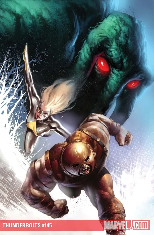 Next morning, Cage debriefs the Thunderbolts. There are about three trolls that have escaped from Asgard since its fall and have gone on a killing spree. Their transportation, Man-Thing, has been fitted with an implant developed by Hank Pym that can allow them to use the creature to teleport anywhere. As soon as they arrive at their destination, they are immediately attacked by the trolls. As Juggernaut and Moonstone give chase, Ghost and Crossbones check out a third trolls moving away from the others while Songbird keeps an eye on Man-Thing. Juggernaut tries mowing down trees, only to learn the hard way that the trolls are adept in the forest. Cage punches one, only to be slammed into the ground by another. Songbird attempts to corral them with a sound barrier but they easily punch through. Moonstone is able to pin them down with a tree. Unfortunately, Juggernaut starts charging, causing a massive explosion. Meanwhile, Crossbones and Ghost are attack by something not a troll, but a girl in troll skin, armed with an axe.