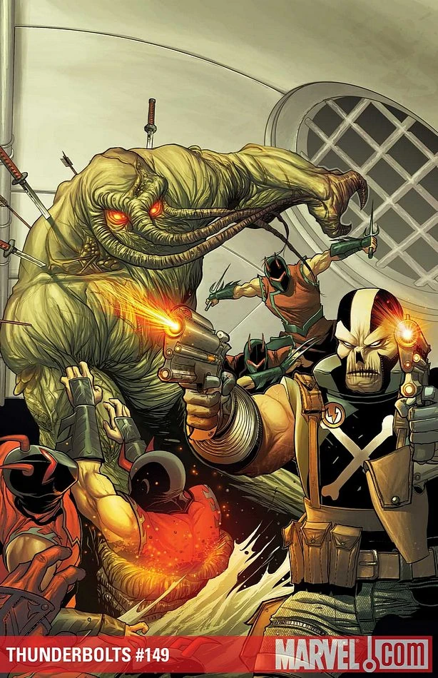 Songbird takes Fixer to the hospital and leaves the rest of the Thunderbolts to complete the mission. Ghost manages to track down the ninjas who escaped, and Juggernaut opens a path to them by smashing a hole in the ground. The team finally reaches an underground fortress, where Moonstone and Juggernaut act as heavy hitters against the ninjas, while Ghost and Crossbones infiltrate the stronghold to try and rescue the prisoners.