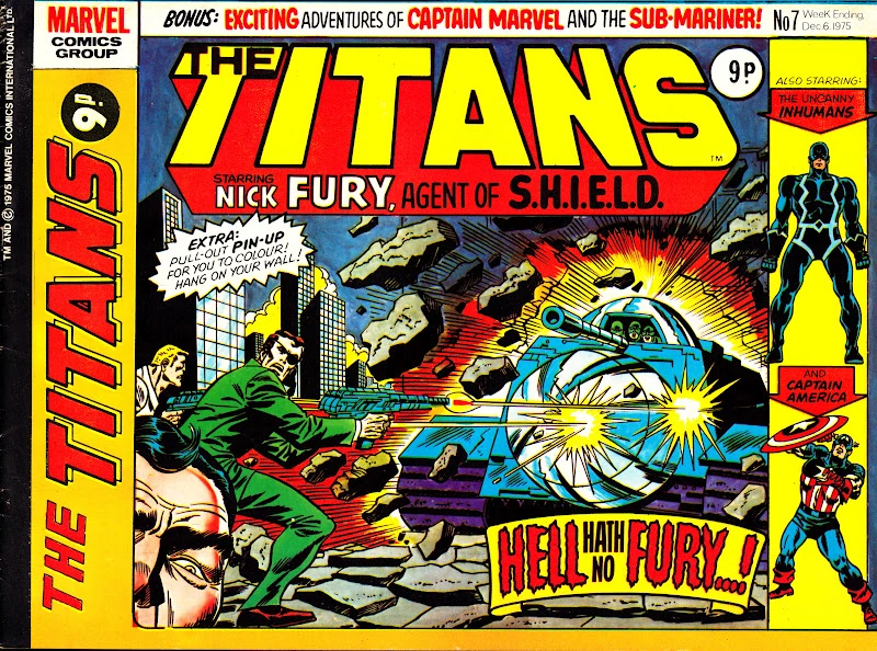 Elsewhere in Britain, Sgt. Duffy's US military force is stationed and preparing for operations against Nazi opposition on British soil. Among the troop are Steve (Captain America) Rogers and Bucky Barnes. While Steve is on a mission in his civilian guise, their base is attacked by the Nazis, prompting Bucky to change into his costumed guise, however he is captured in combat, and taken to Dr. Rawling's castle.