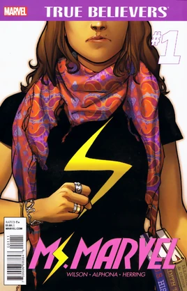 As the Terrigen Mists activate Kamala's powers, she has a hallucination with The Avengers. She admits that she wants to look more like Captain Marvel. They disappear and Kamala finishes undergoing her Terrigenesis. She finds that she gains blond hair like Captain Marvel with a similar Ms. Marvel costume.Solicit Synopsis