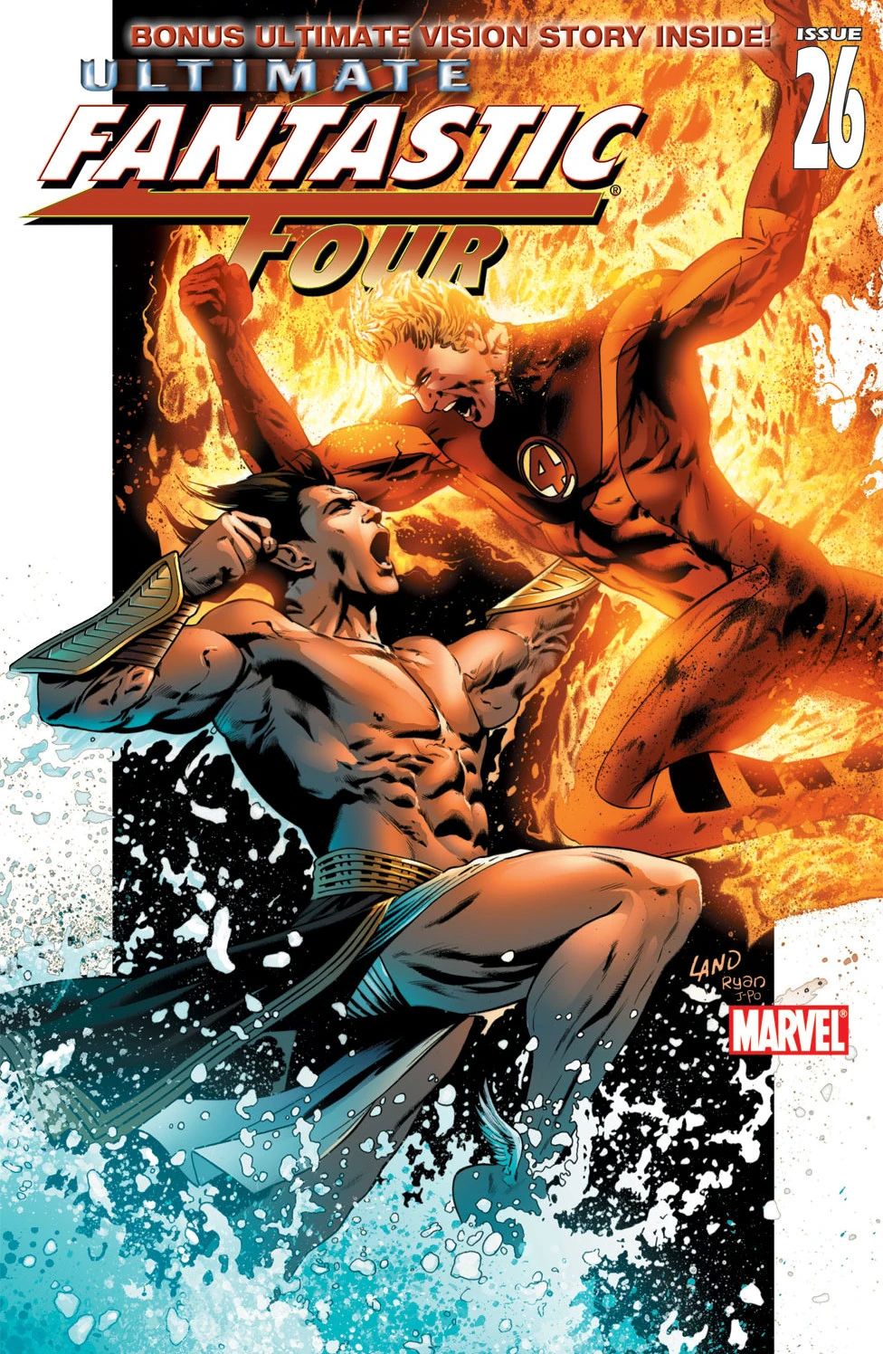 The Fantastic Four battle Namor in Manhattan, Namor taking the upper hand and knocking the Thing streets over and the Human Torch unconscious. Mary and Franklin Storm work in the background, trying to contact the Ultimates and the X-Men but have no luck. As Sue is being attacked by Namor, Reed comes to the rescue, arriving in Fantastic Oh-Five, giving him the strength of Grimm, the shields of Sue, the fire power of Johnny, and his own stretching ability. While medics check on the other team members, Reed takes a hold of Namor, using the fantastic four's powers against him. Namor fights back but has difficulties getting through Reed's shields. Namor does not see what Sue sees in Reed when she could have a God, like him. Namor finally breaks through the shield protecting Reed, taking him out of the Fantastic Oh-Five.