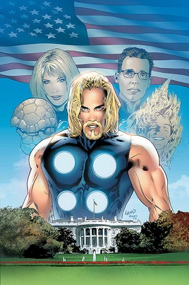 In the New World, Reed Richards is Vice President of the USA to Thor. Instead of an accident giving powers the Fantastic Four made first contacts with the Skrull alien race who are planning to visit Earth. In this new world there is no poverty and virtually no crime. In addition to this every man, woman and child on the planet has super powers.
