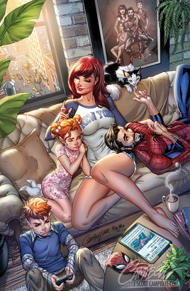Peter and MJ dine at a fancy dinner restaurant with Harry Osborn and his wife, Gwen Stacy. Harry and Gwen have been married for eight years, however they do not have any kids, fearing the world they would be brought into. MJ tells Harry and Gwen how she began her PR Firm. Initially, she was a model who began doing her own branding. People liked what she was doing, which led to her being hired by Bayham-Laroche and subsequently poached by Smith and Altmann's executive suite. Later, she quit her job and started her own marketing firm. Recently, she began helping Uncle Ben and J. Jonah Jameson with their news startup.