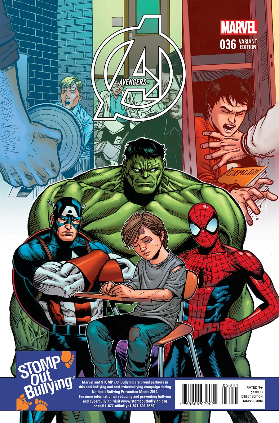 Number of Covers: 7 Date: October, 2014 Released during National Bullying Prevention Month, this wave of variant covers partnered Marvel with the organization STOMP Out Bullying to help rise money and awareness, depicting Marvel heroes supporting and defending kids victims of bullying. |