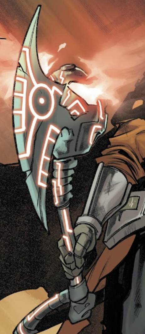 After Orbis Stellaris wiped out everyone on the planet, Moira managed to survive and designed the Weapon M in a desperate attempt to go back to her first life. She killed Omega Red and harvested his Carbonadium coil. She harvested Logan's corpse for his adamantium coated femur, which she used as the base of the axe. She severed Xorn's head in order to use his black hole powers to cut through time and space and she finally harvested Gentle's corpse and removed his vibranium tattoos, which she used to bind the Weapon's components together. The last piece she needed was a piece of Mysterium, which she managed to procure when the X-Men came looking for a human Moira throughout the timelines created by the Moira Engine.[1]