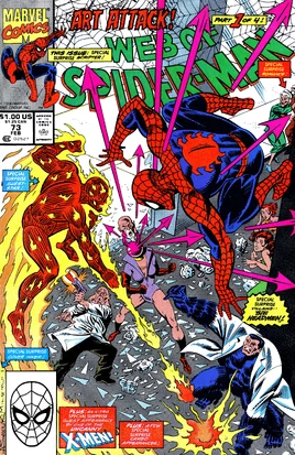 Peter Parker and his wife Mary Jane and her cousin Kristy are invited along with Aunt May and her new boyfriend, Willie Lumpkin to attend the opening of an art exhibit.[Continuity 1] On the cab ride there, everyone is being entertained by Willie Lumpkin's ability to wiggle his ears. Although Peter is having a good time, his stomach is upset after eating Willie's lasagna for supper. Soon they arrive at the art gallery in Greenwich Village. There they discover that the exhibit is that of Alicia Masters, a long time associate of the Fantastic Four, who Willie had gotten to know during his stint as their mailman.[Continuity 2] Willie invites everyone to have a look around. When Mary Jane swoons over Alicia's husband the Human Torch, Peter brushes him off as not such a big deal.[Continuity 3] Everyone is even more star-struck when Namor the Sub-Mariner arrives with his date Carrie Alexander.[Continuity 4] Namor's presence even gives pause to the gallery's celebrity guests.[Continuity 5] Going to get refreshments, Peter bumps into Johnny Storm, the Human Torch, and the pair exchange insults about the pair riding on the coattails of their respective spouses.[Continuity 6]