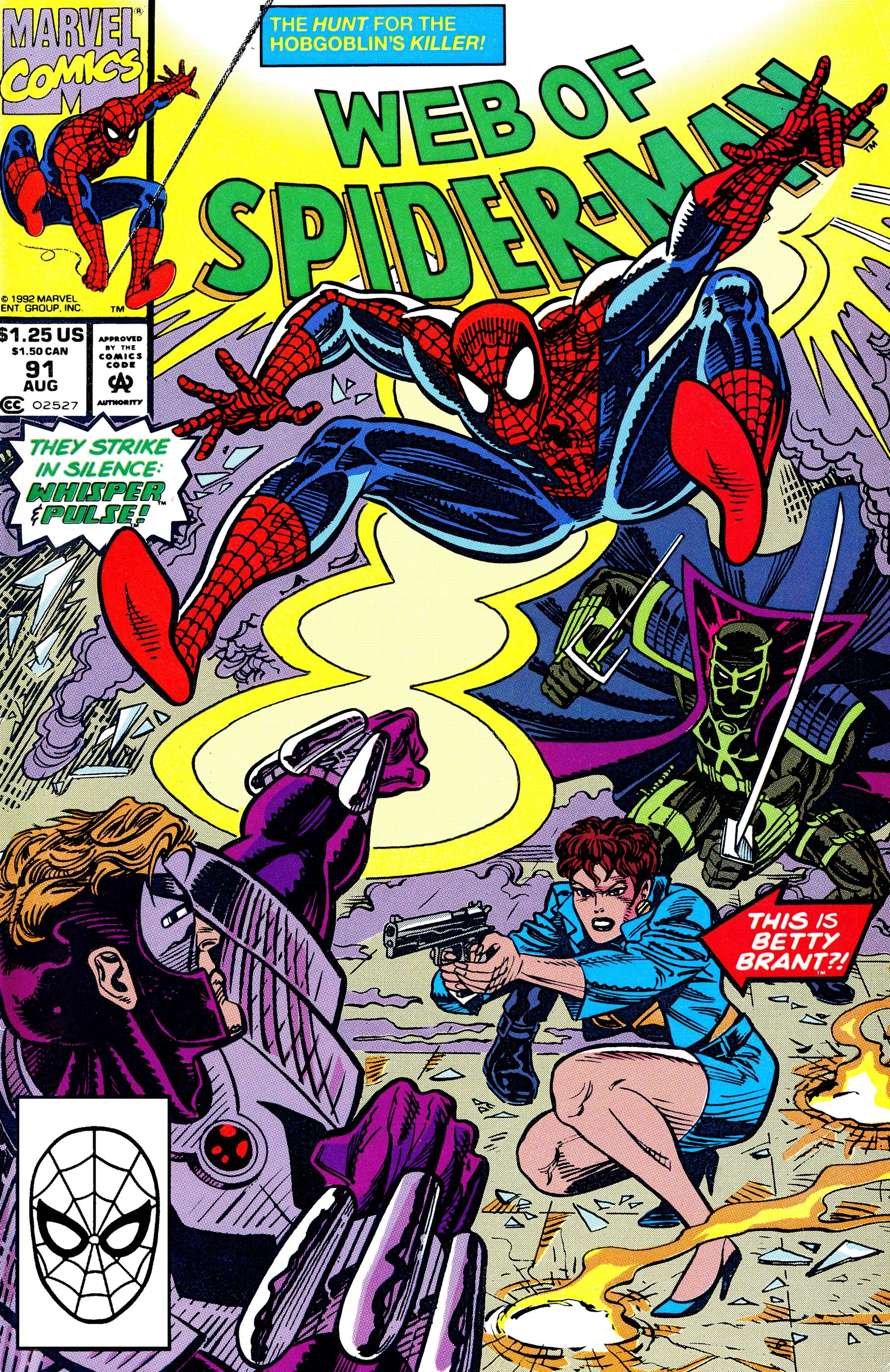 Spider-Man soon finds himself double teamed by the two attackers. Wondering what Betty has gotten herself into, Spider-Man tosses Whisper into the path of Pulse's next shot. With their mission in jeopardy, Pulse reports back to his employer, saying that the mission is being aborted, since Whisper is dead and authorities are arriving on the scene. Not able to escape without compromising the mission, Pulse executes a failsafe that transmits the data back to the mainframe and activates a self-destruct sequence. He then sits down on the floor next to his ally, Whisper. His spider-sense going off, Spider-Man pulls a protesting Betty Brant to safety. As police arrive on the scene, Spider-Man tries to warn them of the impending explosion when it suddenly goes off. Spider-Man pushes Betty to the ground, shielding her from the blast. However, Betty is less than happy with Spider-Man's interference, telling the wall-crawler she doesn't need the help of a man to help her take down the Foreigner, the man who arranged for the murder of her husband Ned Leeds.[Continuity 5]