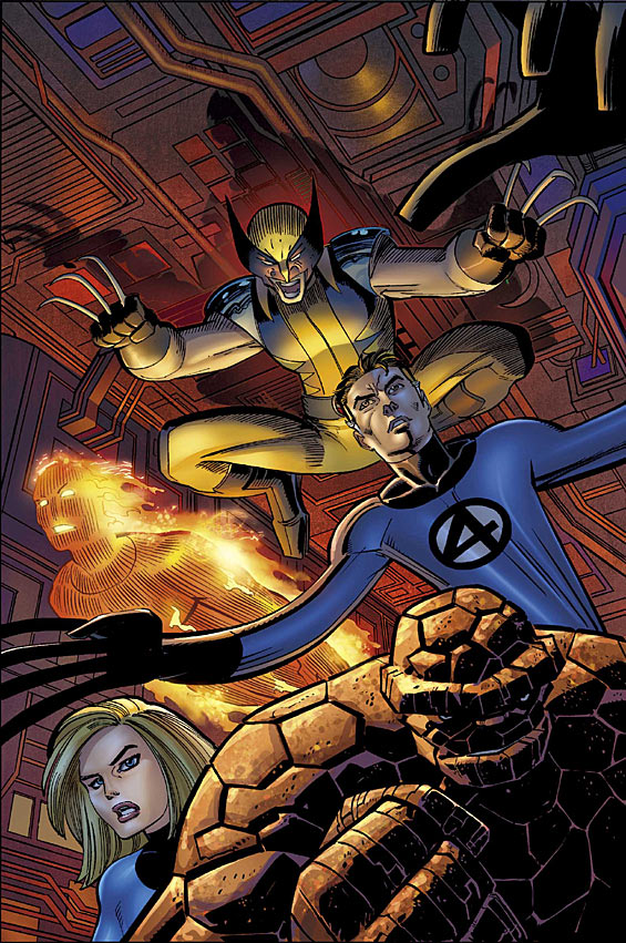 Wolverine, under Hydra's influence, has infiltrated the Baxter Building and now spies on the Fantastic Four. Unaware of this, Mr. Fantastic convenes with Tony Stark and Hank Pym in a secret area of "non-space". Where the three geniuses discuss Reed's newest invention: a potentially dangerous "Terraformer" intended for wiping out world hunger. Suddenly, Reed discovers that their sanctum is being hacked and announces Wolverine's location in the Data Room. The Human Torch grabs hold of Wolverine's wrists, searing flesh and nerves to prevent him from unsheathing his claws. However, Logan overrides their system's protocols and sprays Johnny with the building's fire extinguishers. Wolverine then combats the Thing but again comes out victorious. Reed manages to detain their foe with his malleable body, before Hydra teleports Wolverine sixty feet away; right in front of the Invisible Woman. After alerting S.H.I.E.L.D. of the conflict, Sue blinds and suffocates him with her assortment of abilities. Then a Hydra vehicle crashes through a wall and save Logan, with the Human Torch in "hot" pursuit. The two men collide into a nearby building, and when ambulances arrive, Wolverine again escapes under the guise of an injured Human Torch. The Fantastic Four survey the damage and spot Johnny safely walking away from the wreckage. The fire-fighters, however, are too late in saving the ambulance staff from Wolverine's rampage. Back at Hydra Headquarters, Baron von Strucker acts upon Logan's successful mission; contacting AIM and the Hand, and planning an assault on the heart of the American Banking Industry.